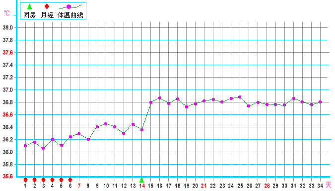 女性月經周期以月經見紅第一天為周期的開始,周期的長短因人而異,約為21-35天不等,平均約為28天,其中又以排卵日為分隔,分為排卵前的濾泡期,與排卵后的黃體期。濾泡期長短不一定,但黃體期固定約為14天上下兩天。排卵后次日,因卵巢形成黃體,分泌黃體素會使體溫上升攝氏0。6度左右,而使體溫呈現高低兩相變化。高溫期約持續12-16天(平均14天)。